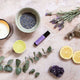 Candle surrounded by ingredients being light.
